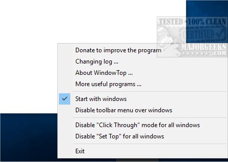 You have additional choices from the app's right-click taskbar icon, including disabling the toolbar menu, click-through mode, and set-top for all Windows.