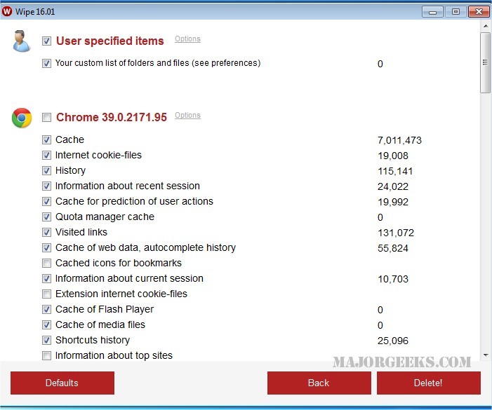 You will be able to delete browser history and cache, index.dat files, registry, Internet cookies files, autocomplete-history, temporary internet files, and many other items. Wipe will also help erase other personal activity tracks while using your PC regardless of which program used: Windows, Internet Explorer, FireFox, Chrome, Opera, etc.